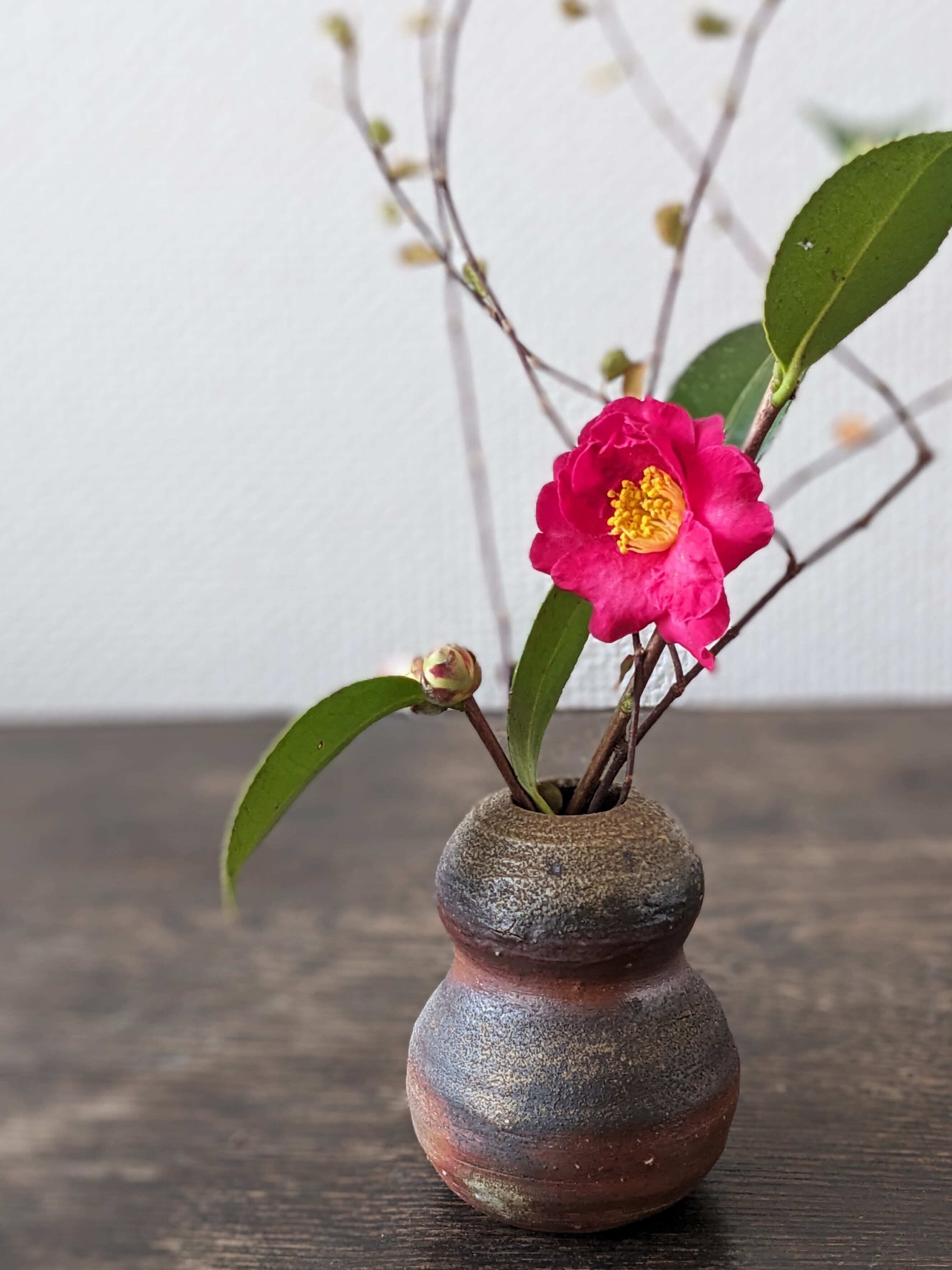 しかし、その可愛らしさとは裏腹にしっかりゴマ(窯焚きの際器に降りかかる灰)のかかった渋い焼けで小さいながら落ち着いた静かな佇まいの花入れです