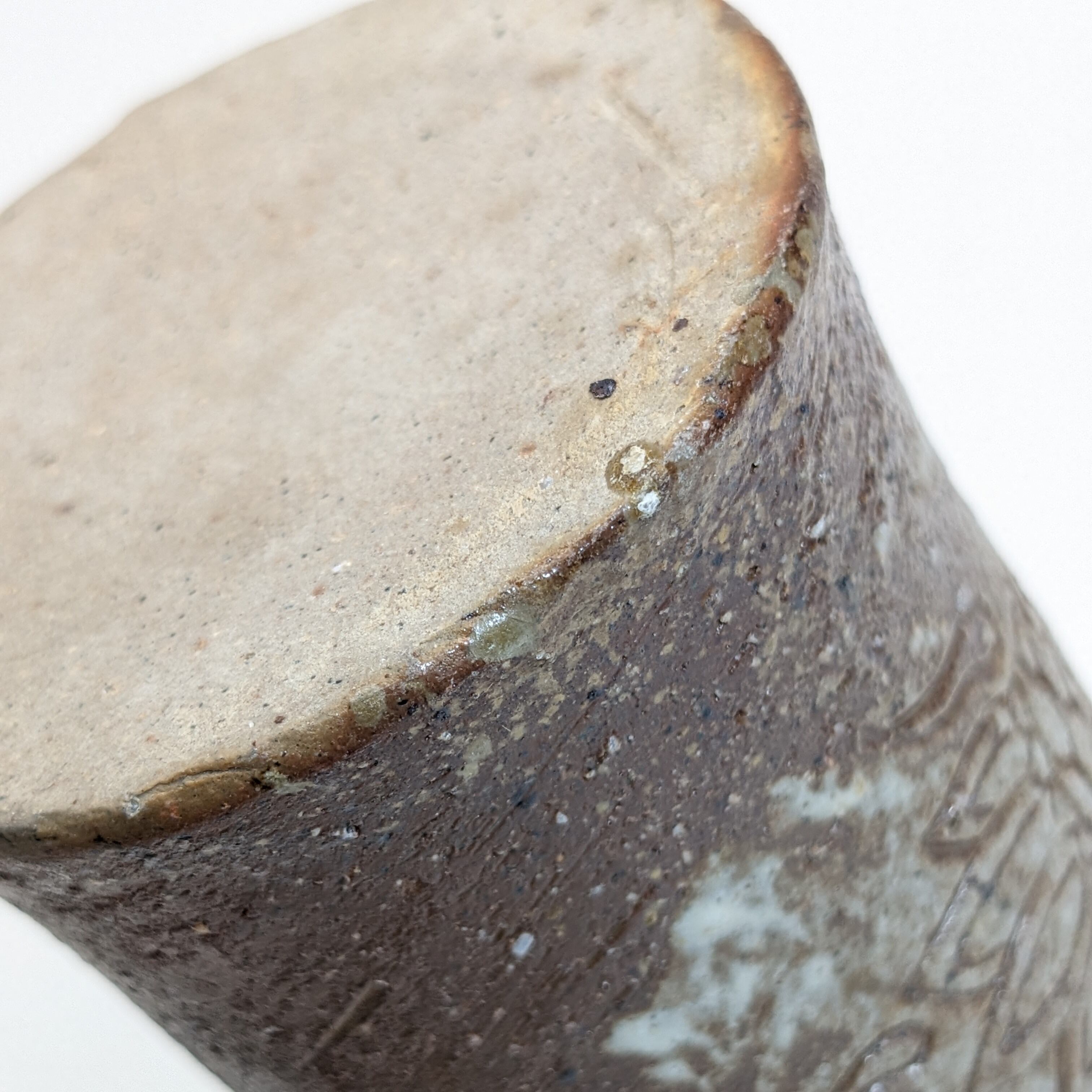 穴窯による強い炎の焼成により灰が吹き付けられた面はその灰が溶け釉薬が掛かったように艶がででいます。反対に裏側には灰が掛からず土そのものの質感が出ており両面で方身代わりのような姿が見られます。